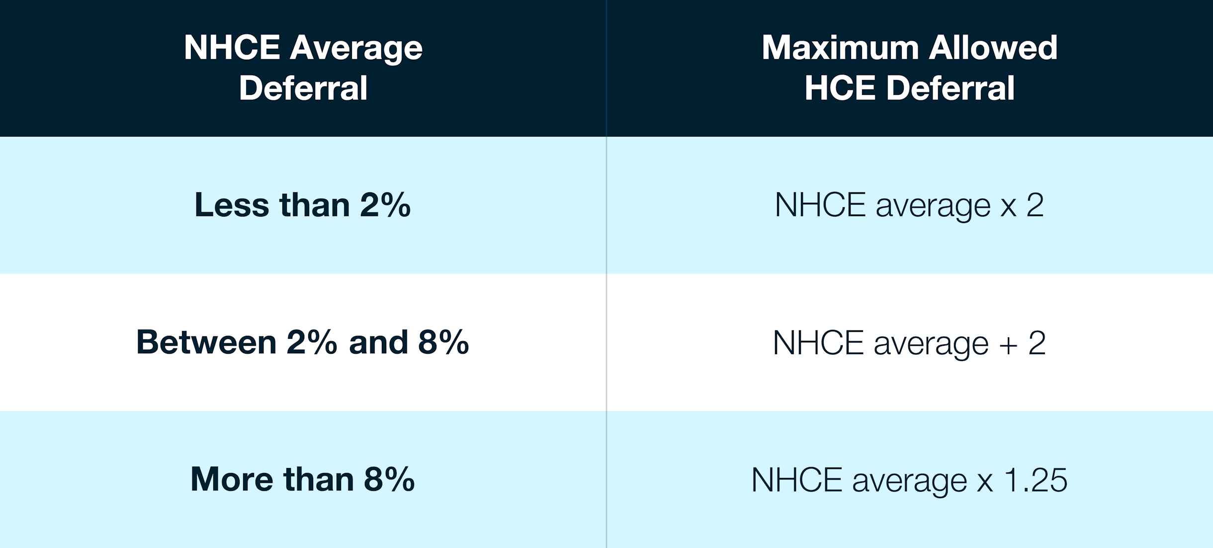To pass the test, the average deferral rate for the HCE group must be within a certain range, or spread, of the NHCE group’s average, as shown below; the ideal spread is 2%.