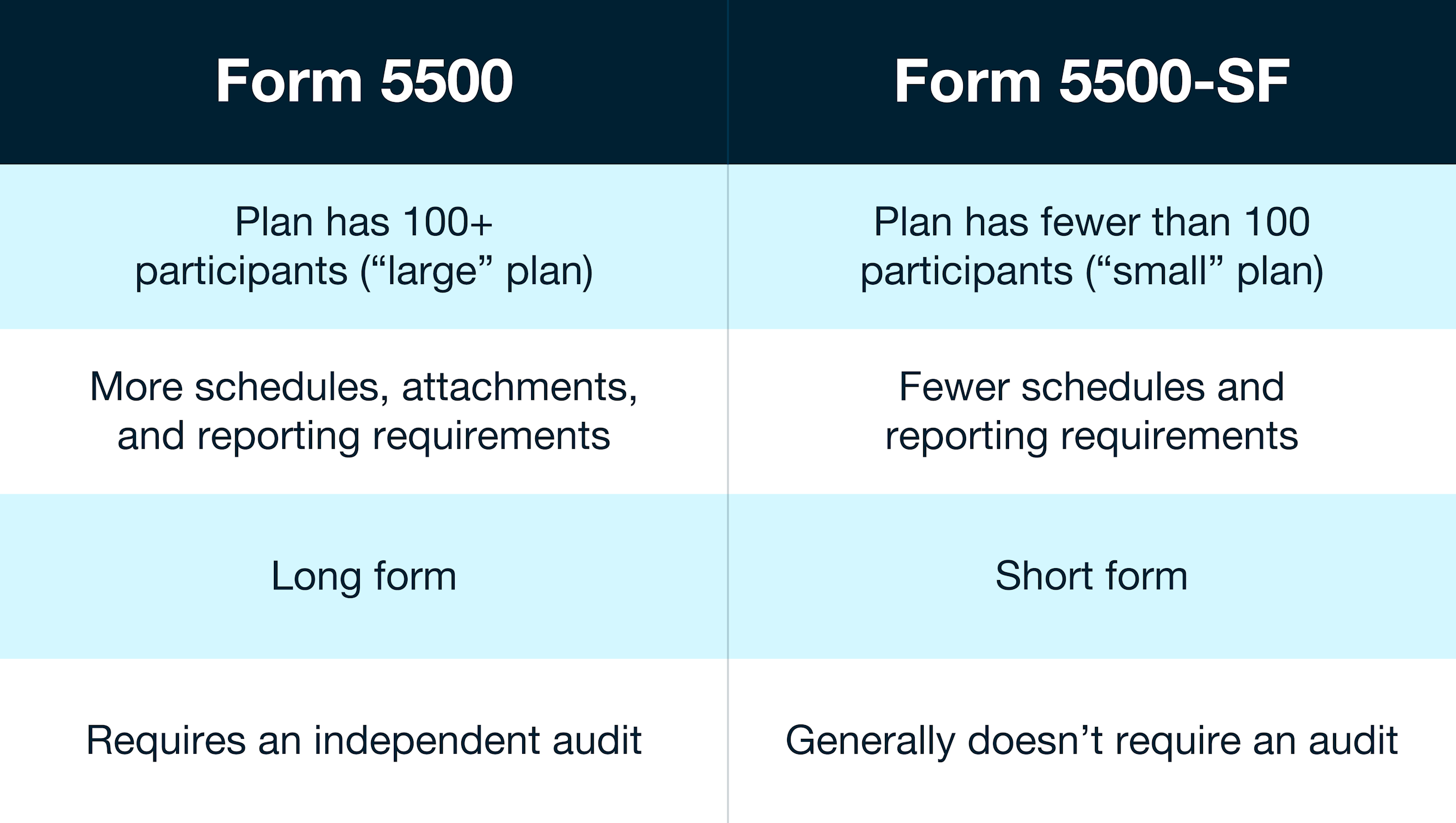 The 5500 comes in more than one type. The form you use depends on the size of your plan, whether it’s “large” or “small.” What’s the difference? It’s the number of participants with account balances at the start of the plan year, including active and terminated participants and beneficiaries.