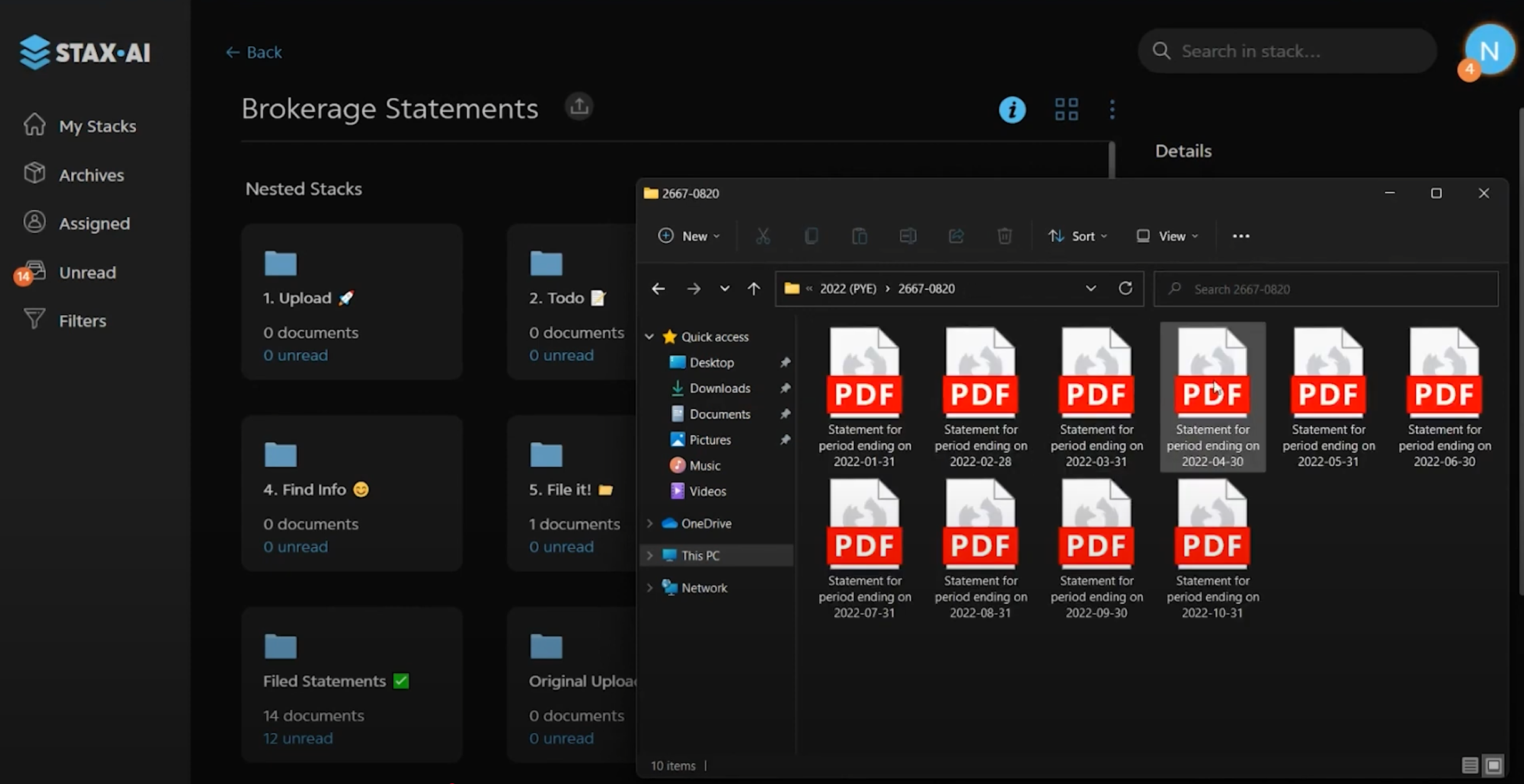 TPAs upload scanned brokerage statements into Stax.ai Trust Accounting, where AI automatically identifies the custodian, plan, and statement type, then files it in the correct client directory—no more manual sorting.