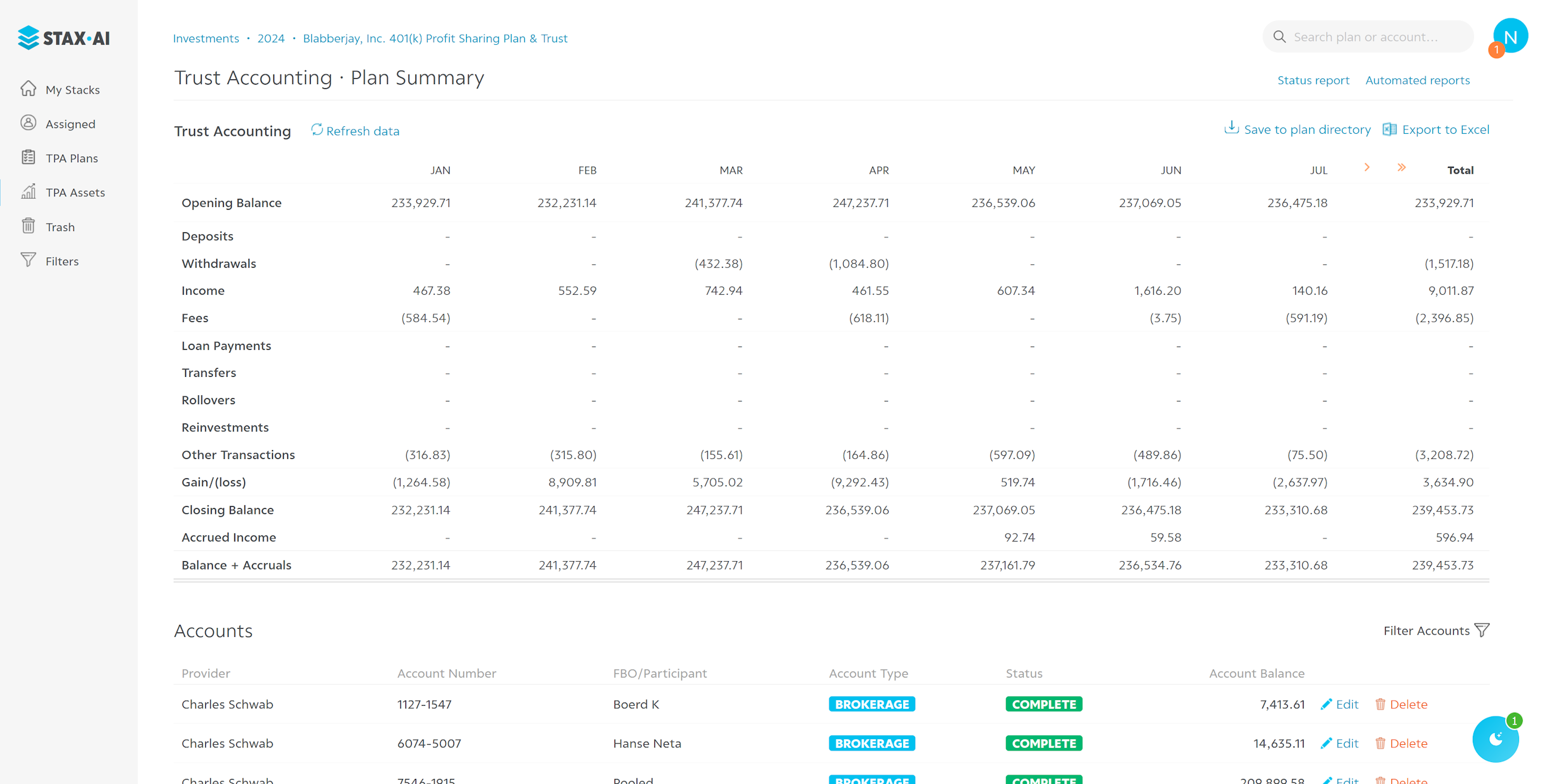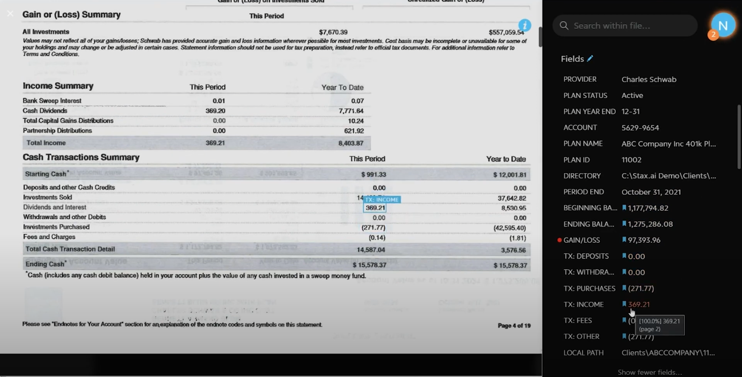 AI reads balances, contributions, withdrawals, fees, and investment changes from brokerage statements, extracting structured data that TPAs can instantly reconcile—no more manual data entry.